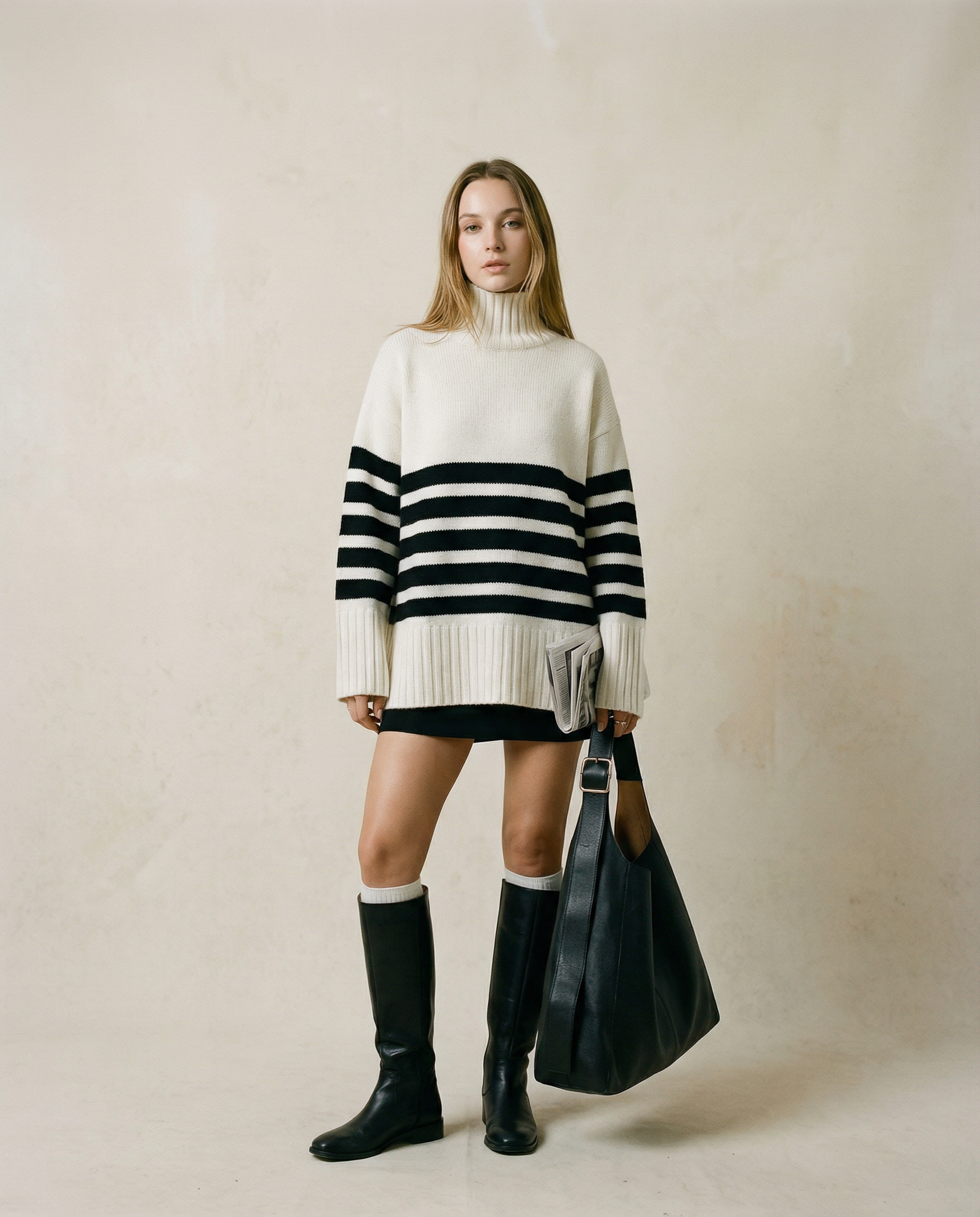 The Elara sweater blends classic stripes with a relaxed oversized silhouette, creating a look that feels both polished and easy. Crafted from a soft knit, it offers warmth without heaviness—perfect for those in-between seasons.